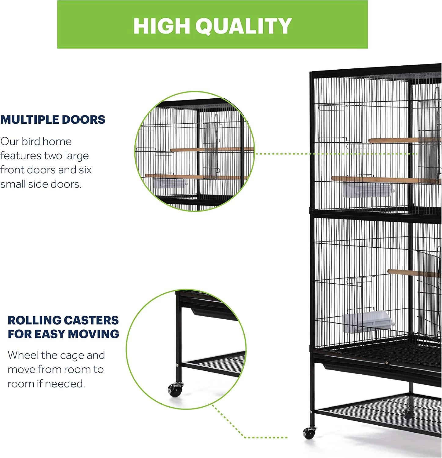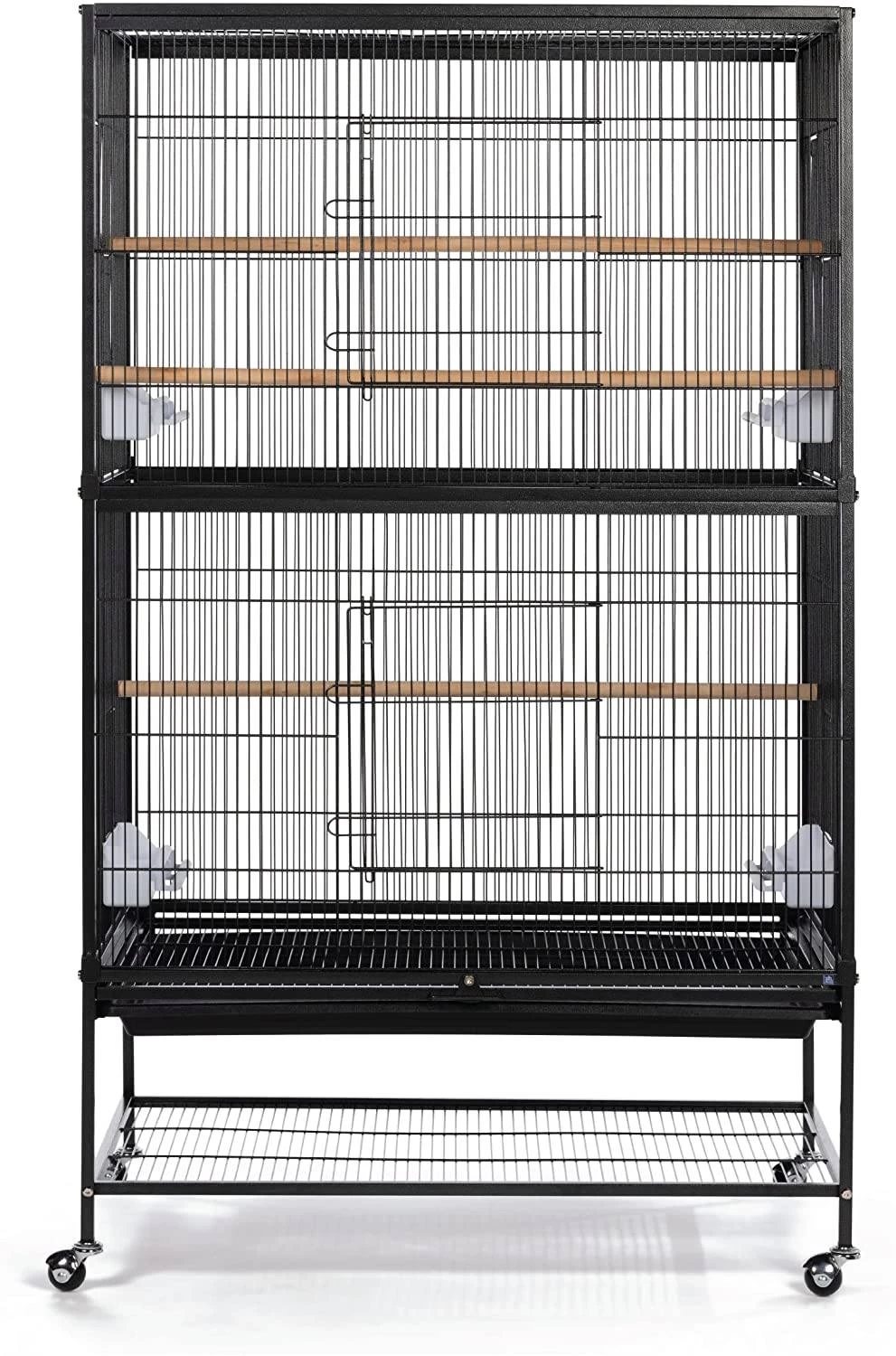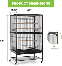Prevue Hendryx’s Black Wrought Iron Flight Cage with Stand is the perfect home for multiple parakeets, canaries, or finches. This amazing product has two large hinged front access doors as well as six small side access/nest doors. The cage has a pull-out grille and debris tray for easy cleaning, and comes with four plastic double cups and three wood perches. As an added bonus, the base of the cage features an integrated shelf for storage and easy-rolling casters for portability. In addition, the Wrought Iron Flight Cage is easy to assemble, has 0.5″ wire spacing, and is a great showcase for your birds.