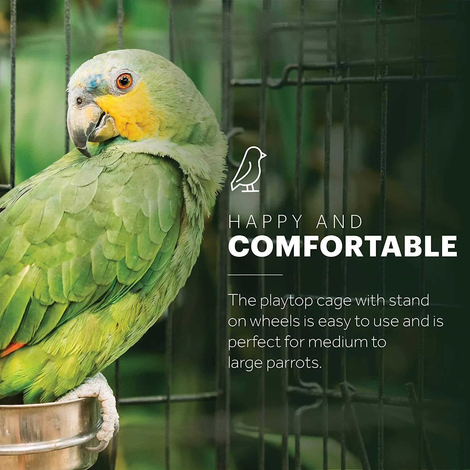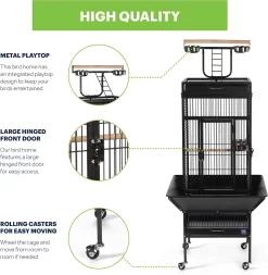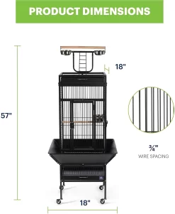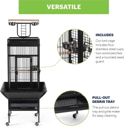 Prevue Hendryx’s Black Wrought Iron Select Bird Cage with Playtop is the ultimate home for your cockatiel or similar sized bird. This amazing cage is constructed of wrought iron for durability, and features a cagetop playstand to keep your bird entertained and content. In addition, the product has large hinged front access doors with double locks to keep your bird secure. The Wrought Iron Select Bird Cage sits on a castered stand for portability, has 0.75″ wire spacing, and comes with four stainless cups and two wooden perches. As an added bonus, the cage has a pull-out bottom grille and debris tray for easy cleaning, as well as a rounded-corner seed guard to control debris mess.