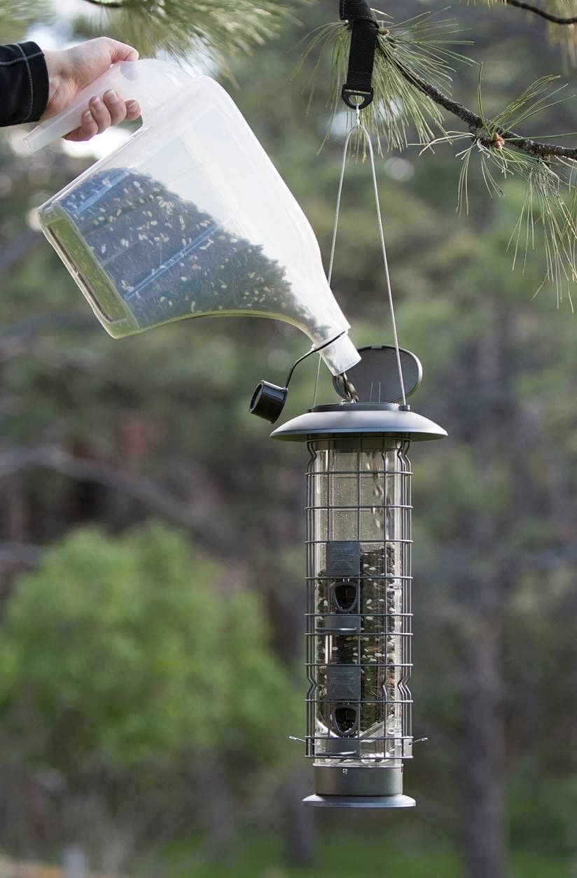 • A squirrel’s weight pulls down the cage to close all feeding ports